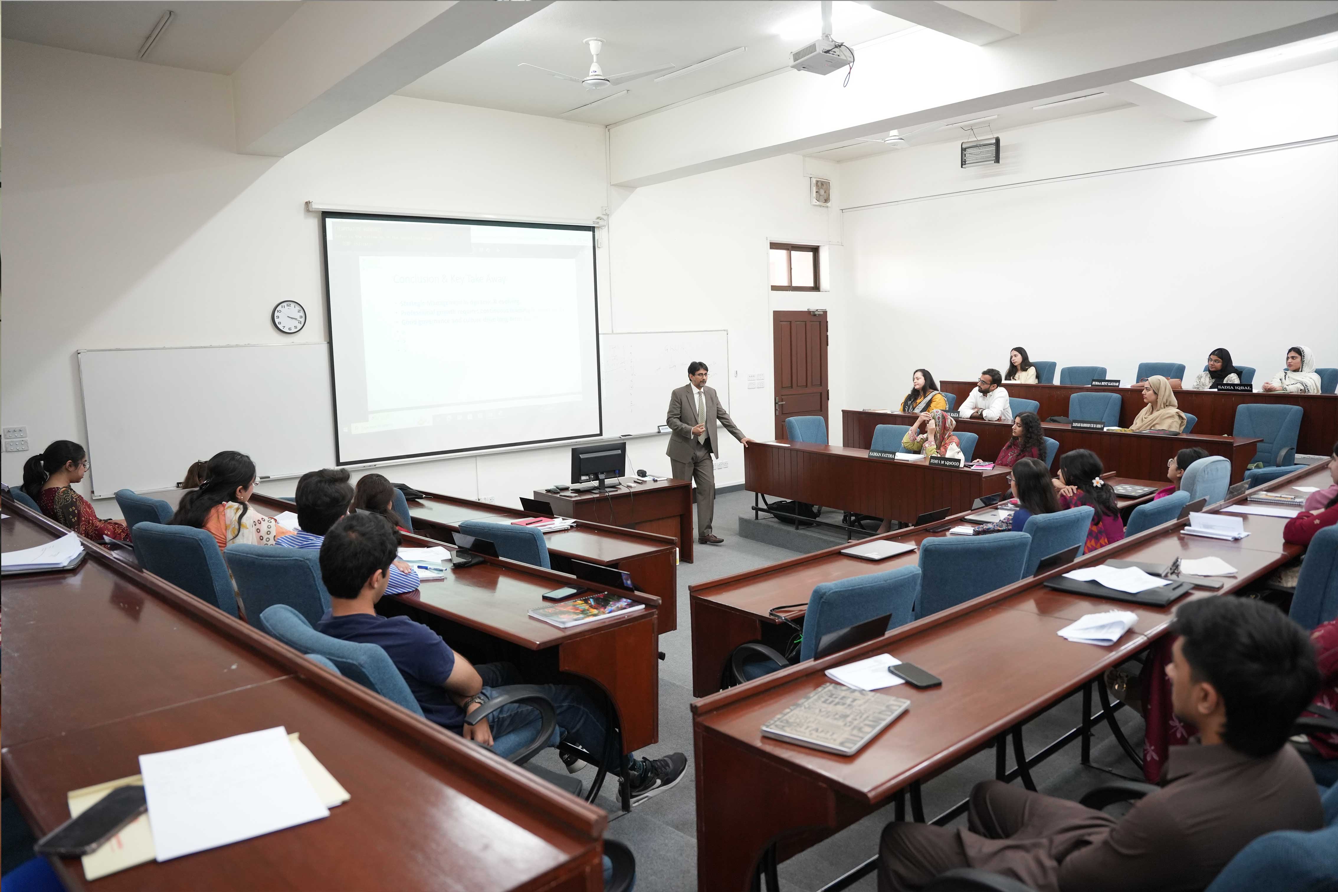 The Corporate Relations Office at the Lahore School of Economics hosted an engaging Distinguished Professional Lecture Series session for Strategic Management undergraduates. Mr Fraz Aslam, Founder and Lead Consultant at KAF Human Excellence, delivered an interactive lecture titled “The Art of Strategic Management”, emphasising strategy as choice and execution. Through active discussion, students explored decision-making under uncertainty, with the session highlighting that sustainable success requires governance, adaptability, and action-driven strategic leadership.