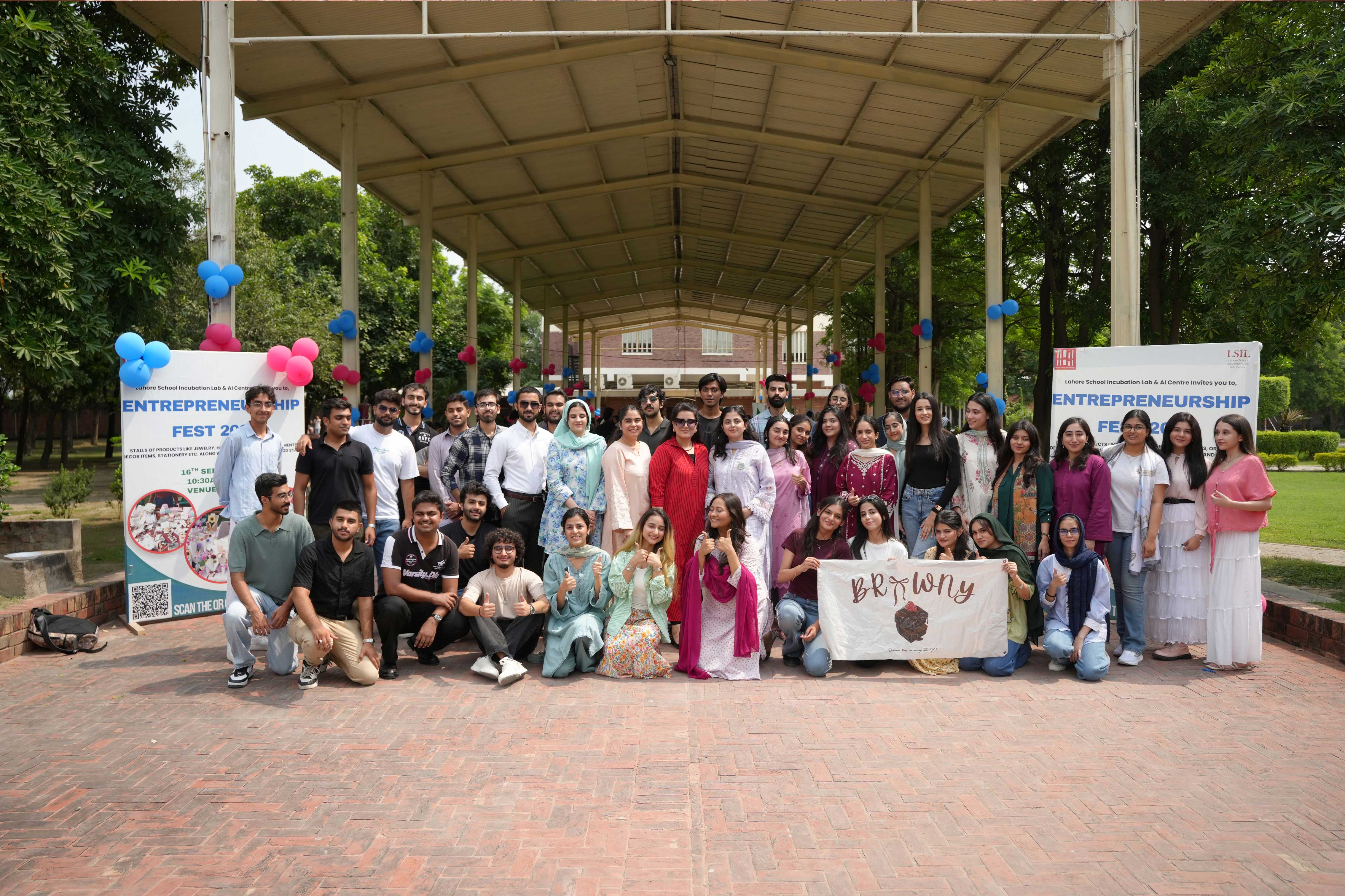 A group photograph of the students and staff of the Lahore School of Economics taken after the successful conclusion of Entrepreneur Fest 2025. This vibrant event was a celebration of innovation, creativity, and entrepreneurial spirit, bringing together the entire campus community. It provided students with an invaluable platform to showcase their business ideas and start-up ventures, demonstrating their passion, dedication, and enthusiasm for entrepreneurship. The festival fostered collaboration between students, faculty, and staff, while reinforcing the Lahore School’s commitment to nurturing future leaders and innovators who are ready to make a meaningful impact in the world of business and beyond.