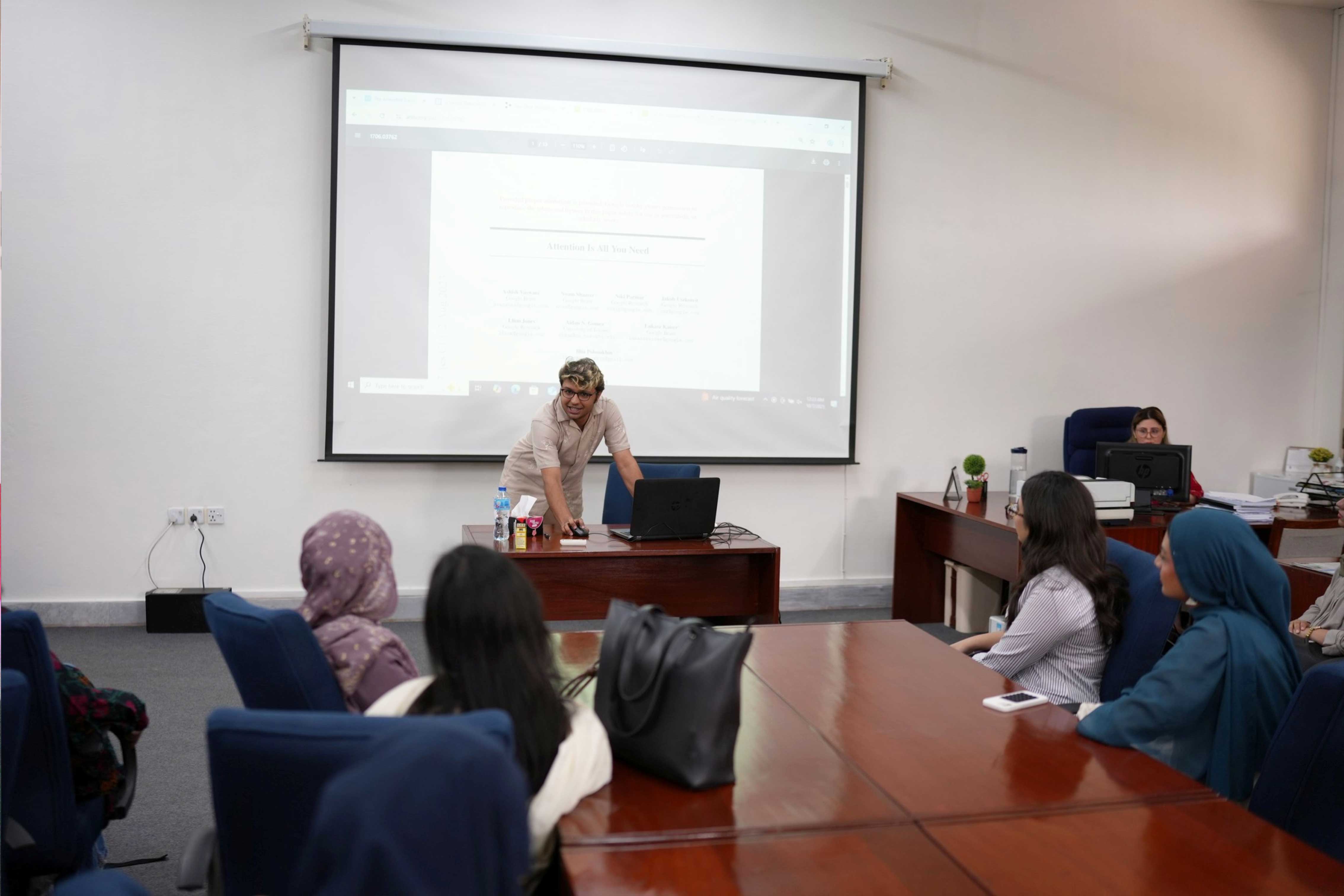 Students of the Print, Radio and TV course at the Lahore school of Economics attended a guest lecture by Dr. Zameer Ahmed, who discussed the changing face of Pakistani media. The discussion focused on the current nature of Artificial Intelligence in news creation and distribution with an eye to the sophisticated ethical issues and complexities that accompany such technological achievements. The lecture led by Ms. Naeema Arshad allowed students to gain a better insight into the future of journalism/media practices in an era of growing digital innovation and AI-based tools.