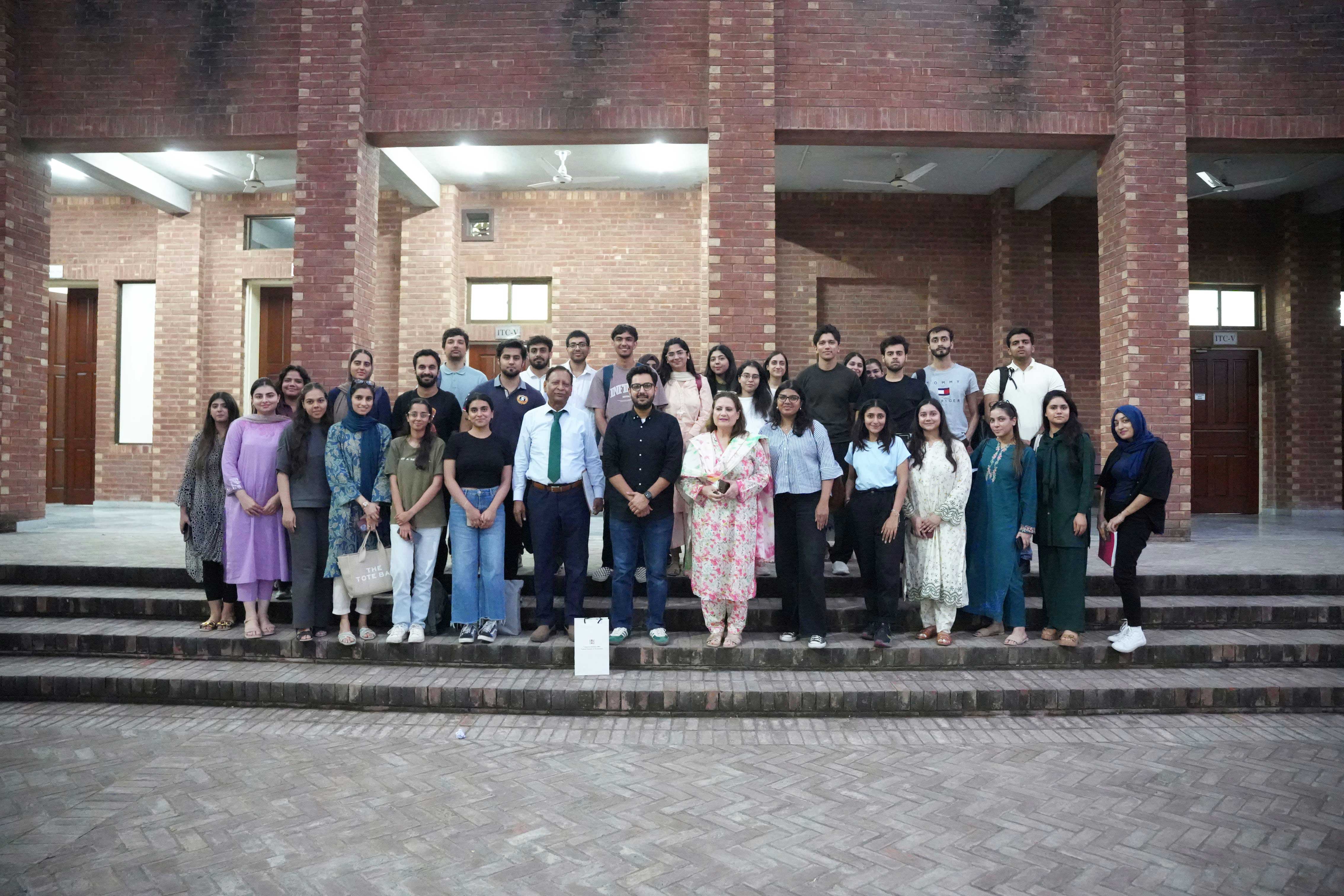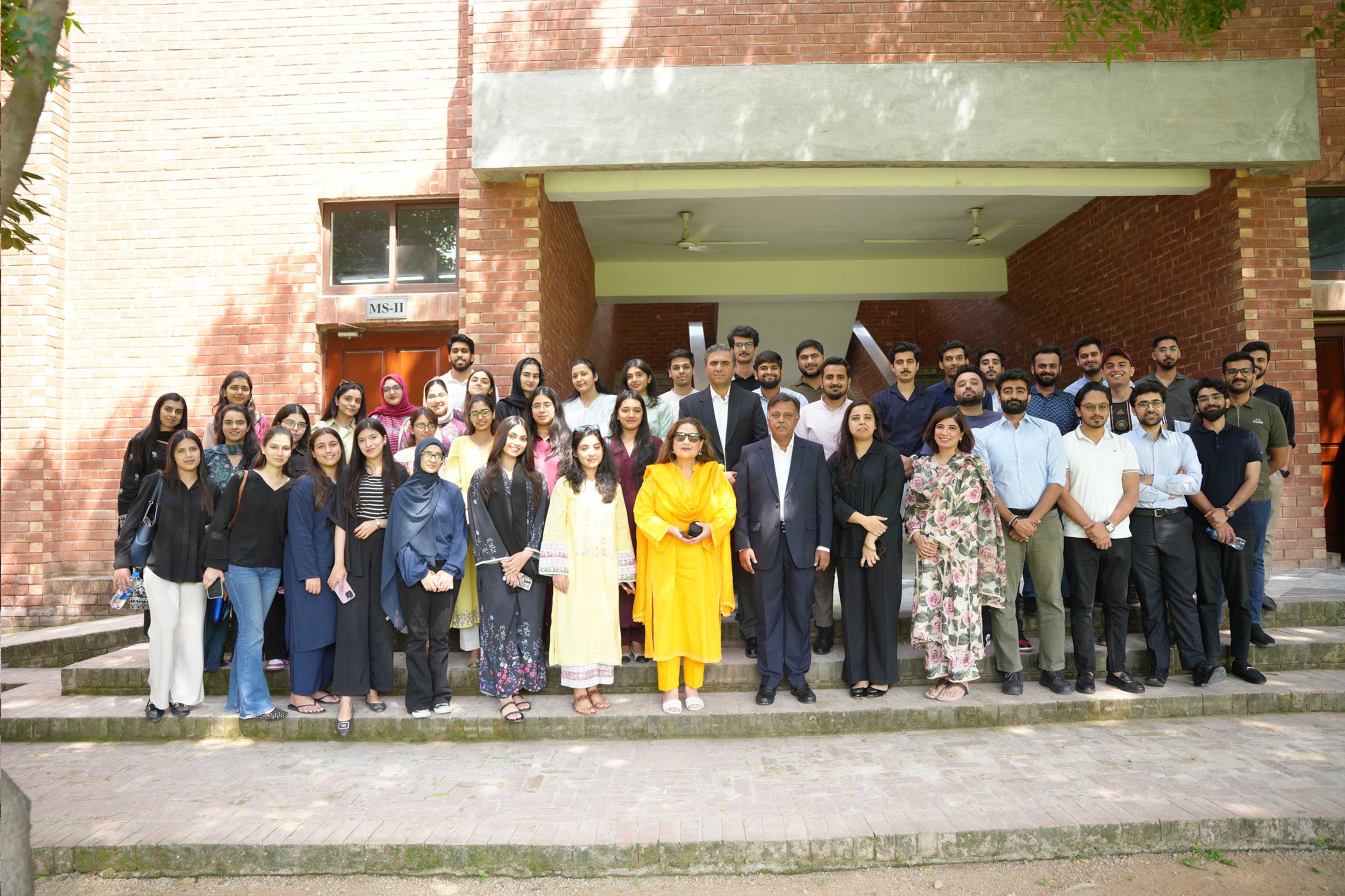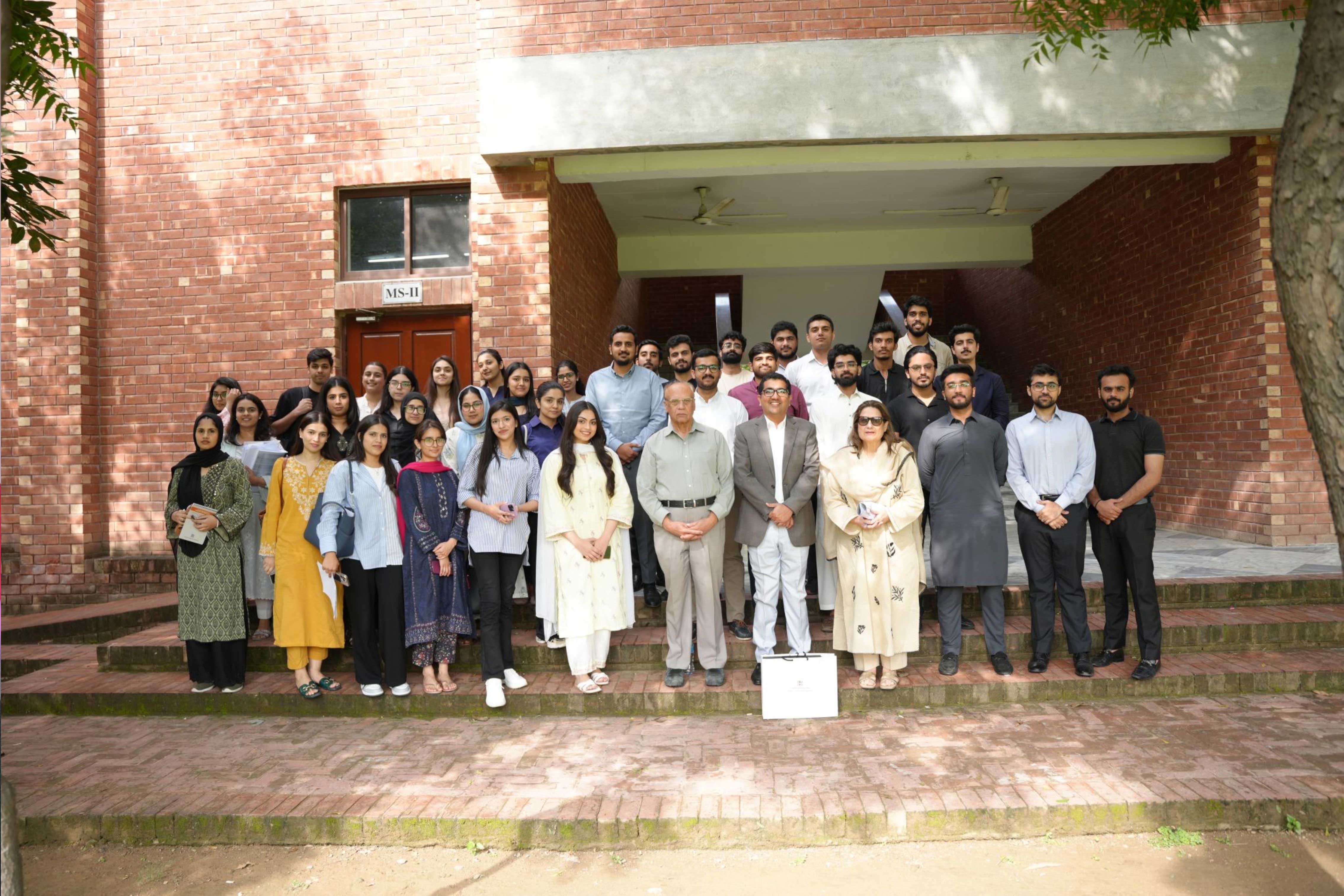 A group photograph with Mr. Shah Jahan, Chief Sales Officer at Dawn Foods Corporation Ltd., Lahore, alongside students of the Lahore School of Economics. Mr. Shah Jahan was invited as a distinguished guest speaker for the Sales Force Management course with MBA II – B, as part of the Distinguished Professional Lecture Series Programme organised by the Corporate Relations Office. During his session, he shared valuable insights on sales strategies, team management, and market dynamics, providing students with practical knowledge and industry perspectives to complement their academic learning and better prepare them for leadership roles in the field of sales and marketing.