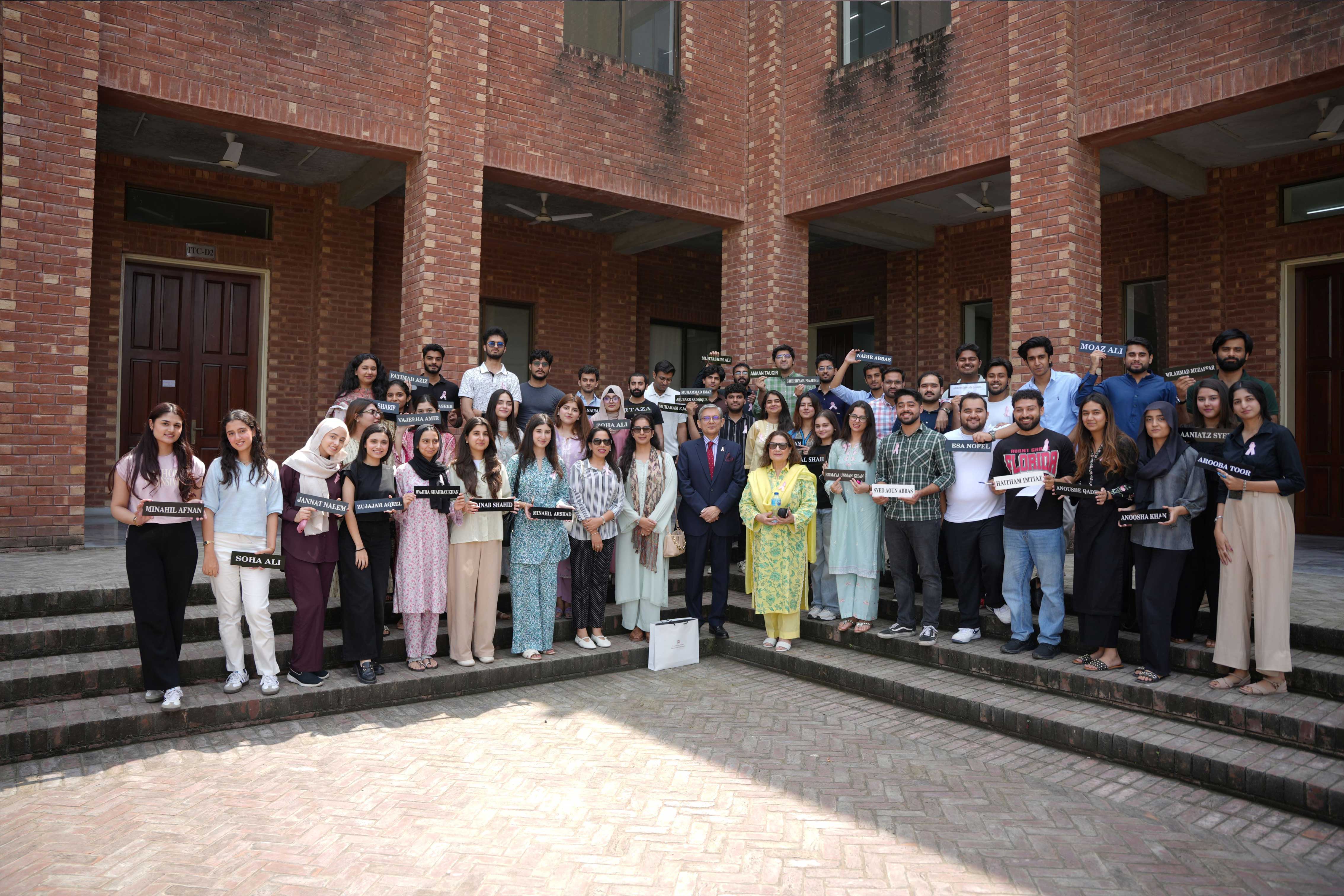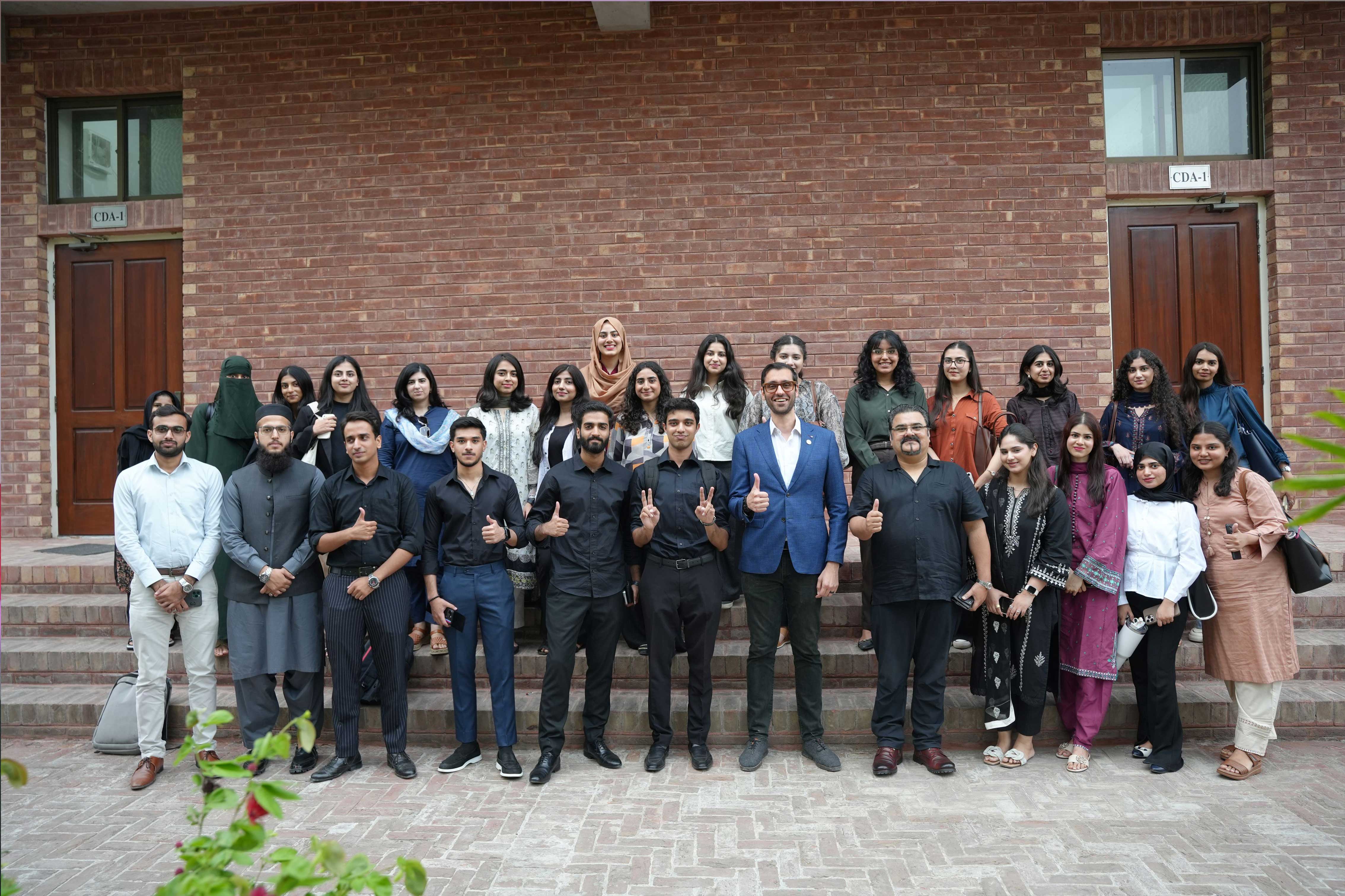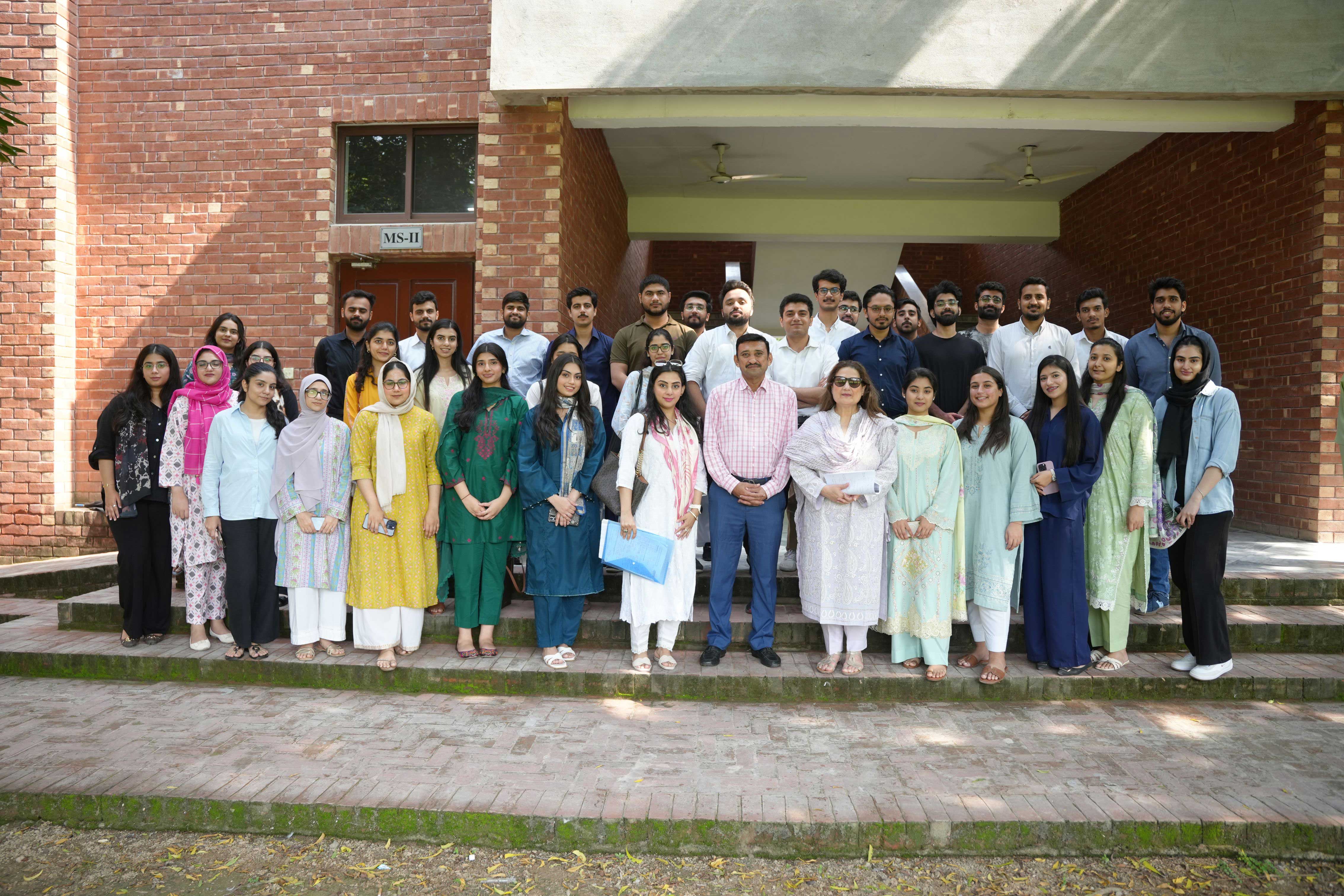 A group photograph with Mr. Shah Jahan, Chief Sales Officer at Dawn Foods Corporation Ltd., Lahore, alongside students of the Lahore School of Economics. Mr. Shah Jahan was invited as a distinguished guest speaker for the Sales Force Management course with MBA II – B, as part of the Distinguished Professional Lecture Series Programme organised by the Corporate Relations Office. During his session, he shared valuable insights on sales strategies, team management, and market dynamics, providing students with practical knowledge and industry perspectives to complement their academic learning and better prepare them for leadership roles in the field of sales and marketing.